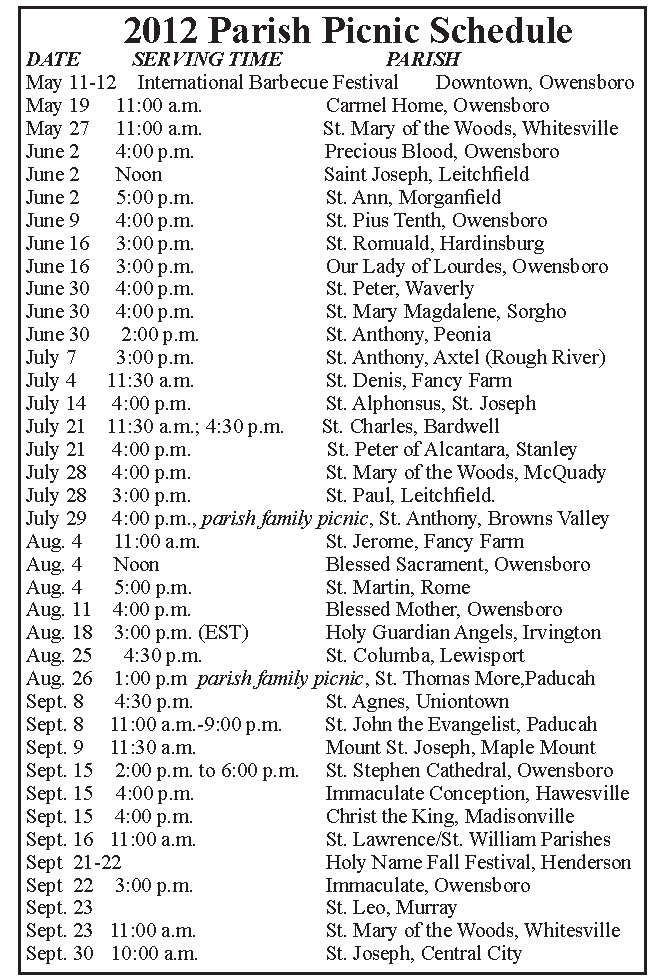 Burgoo has a strong tradition in the Owensboro area, and you might be interested to know that you don't have to wait until September to taste some good burgoo. The region's Catholic Churches have picnics throughout the summer, usually starting in June and scheduled every weekend throughout the summer. Their special brand of burgoo is cooked and served at each festival, which is open to the public. To see a schedule of the parish picnics, click on the link listed at the bottom of this page.
